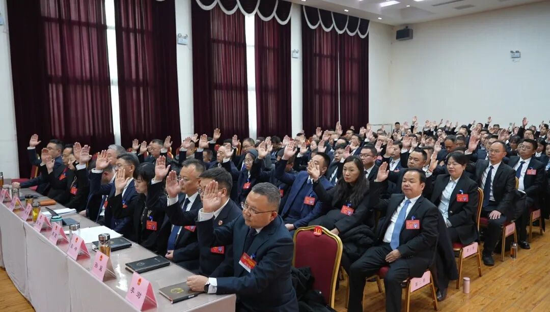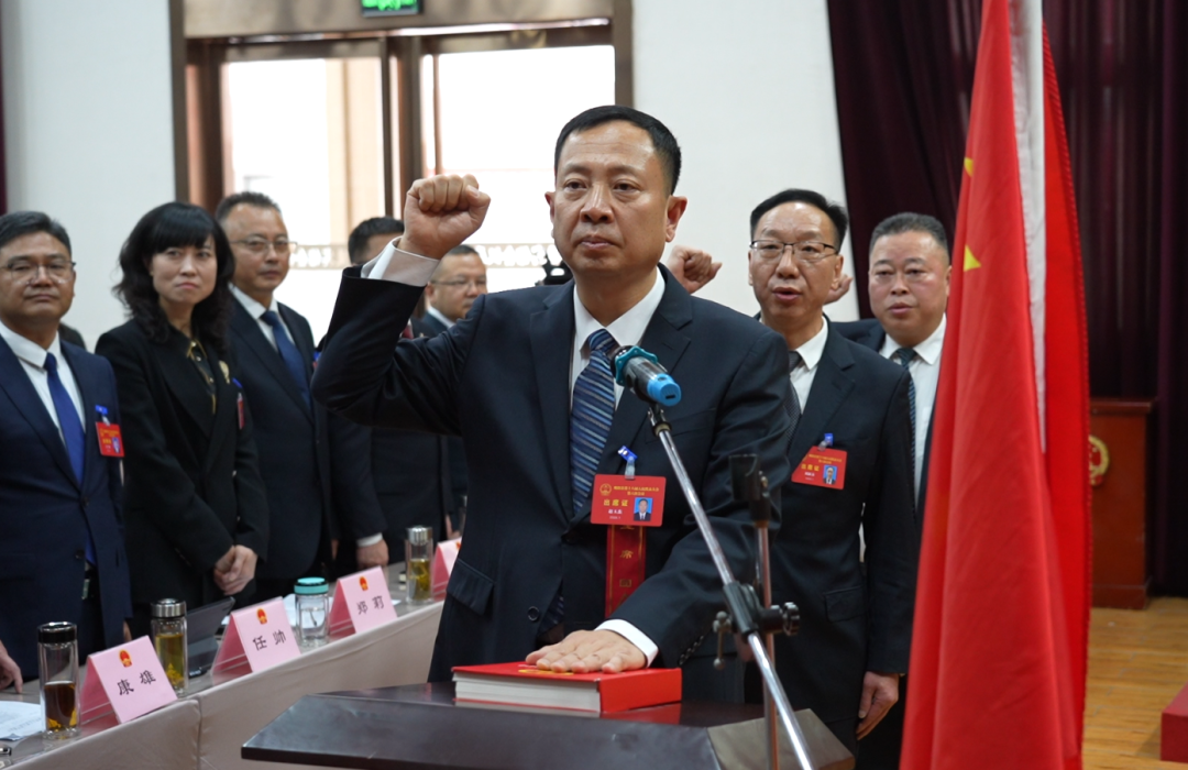 郭华向新当选县人大常务委员会主任赵玉杰和县人大常委会委员颁发当选证书,新当选人员向宪法宣誓。